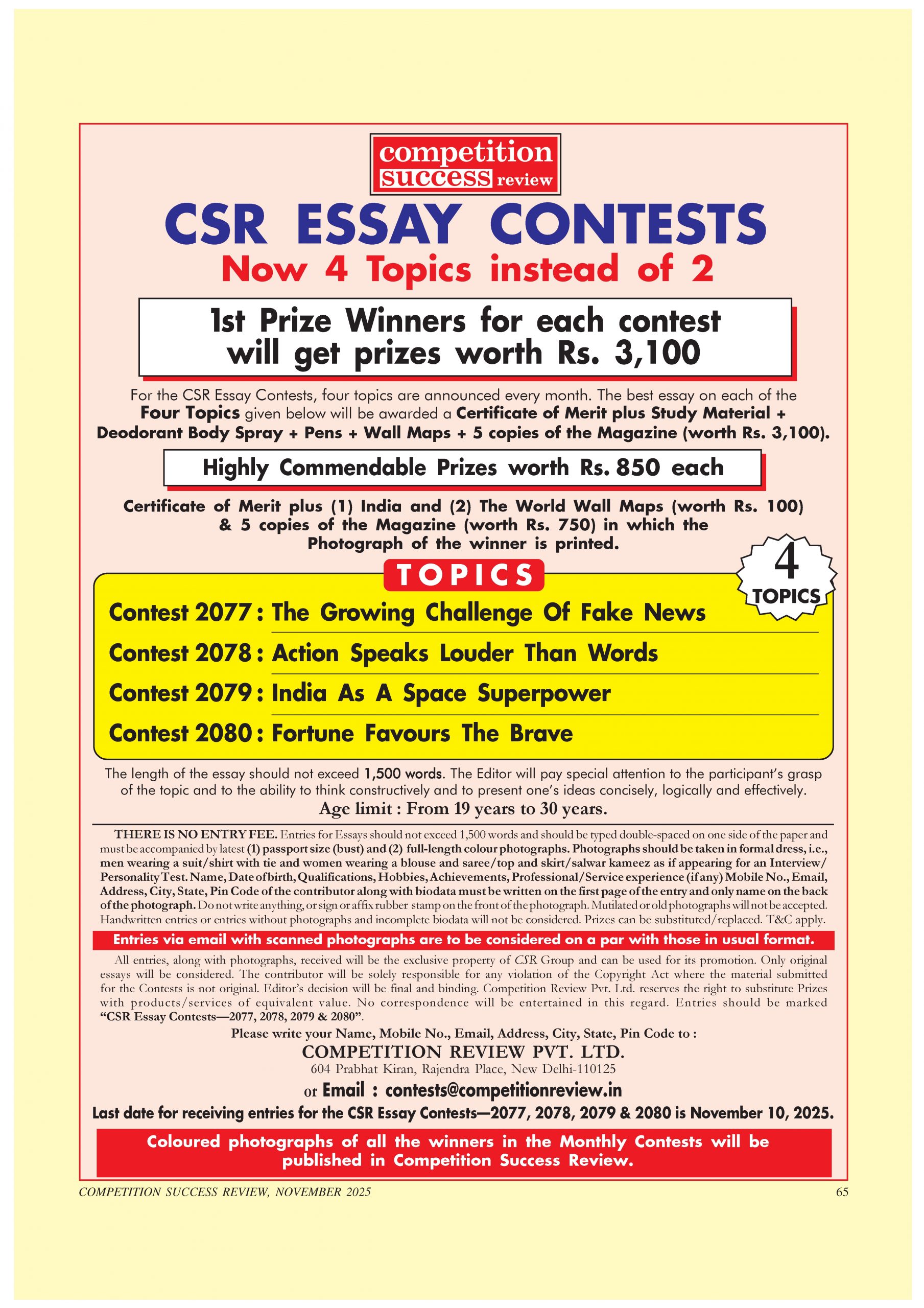 For the CSR Essay Contests, four topics are announced every month. The best essay on each of the Four Topics will be awarded a Certificate of Merit plus Study Material + Pens + Deodorant Body Spray (worth Rs. 3100).
