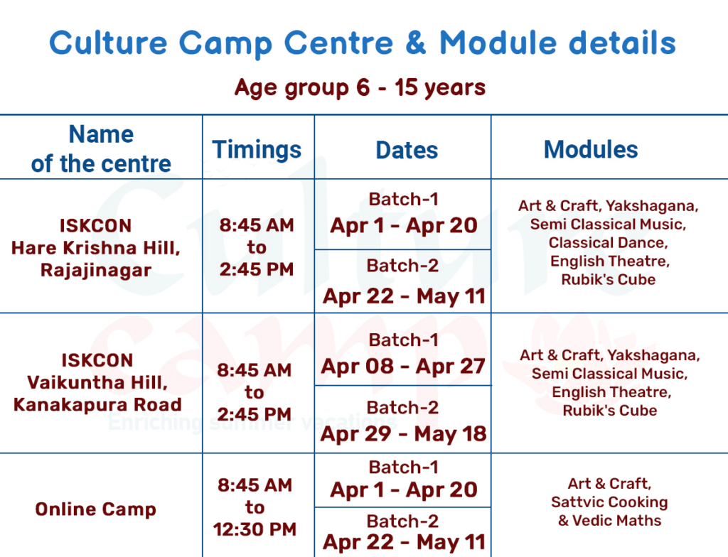ISKCON Samskriti, the cultural wing of ISKCON Bangalore, is accepting registrations from students aged 6 to 15 for the ISKCON Culture Camp 2024, which will take place in hybrid mode from April 1 to May 11.